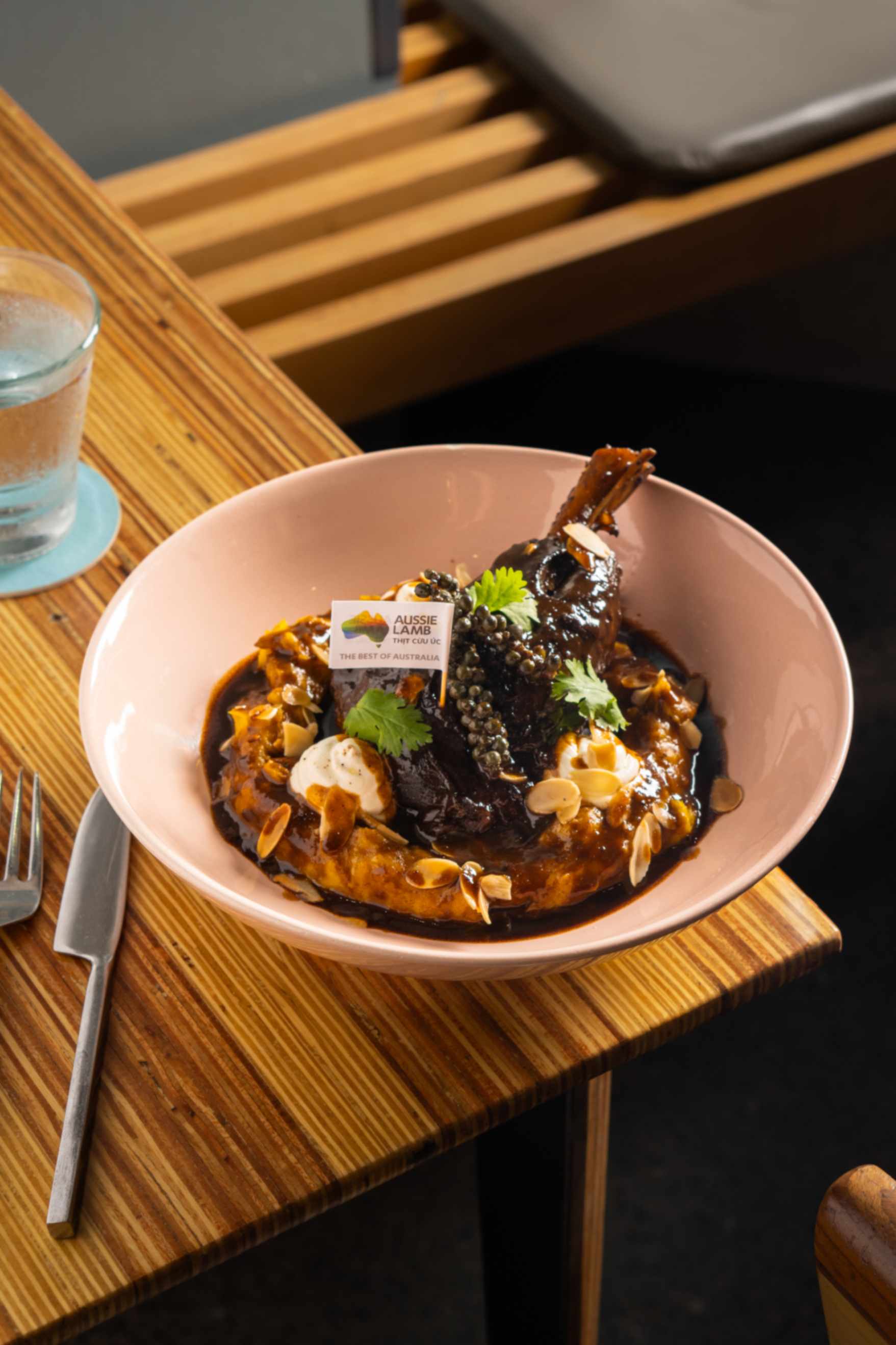 Lamb shank is slow-cooked in a blend of Middle Eastern spices, served with mashed pumpkin and potatoes, and paired with Vietnamese pickled green peppercorns.